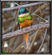 22 cm. Comum em bordas de florestas úmidas e em matas ralas e secas. Vive normalmente aos pares, pousado em arbustos, de onde voa para apanhar insetos, como borboletas e abelhas. Faz ninho em buracos escavados em barrancos ou em cupinzeiros nas árvores. Conhecido também como beija-flor-grande, ariramba-da-mata-virgem, beija-flor-d'água, jacamarici, bico-de-sovela, sovelão ariramba-de-rabo-vermelho e ariramba-de-cauda-ruiva.